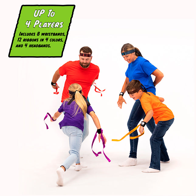 Think like a fox... Move like a monkey... Strike like a cobra... Do you have what it takes to become a true Ribbon Ninja master? Each player has three colorful ribbons attached to his or her wristband. The rules are simple: Snatch your opponents' ribbons before they snatch yours. Lunge, grab, and dodge as quickly and cleverly as you can - The last ninja standing with at least one ribbon left wins the game! Easy to learn yet challenging to master, Ribbon Nina is a fast-paced adventure that's sure to keep everyone active and on their toes.