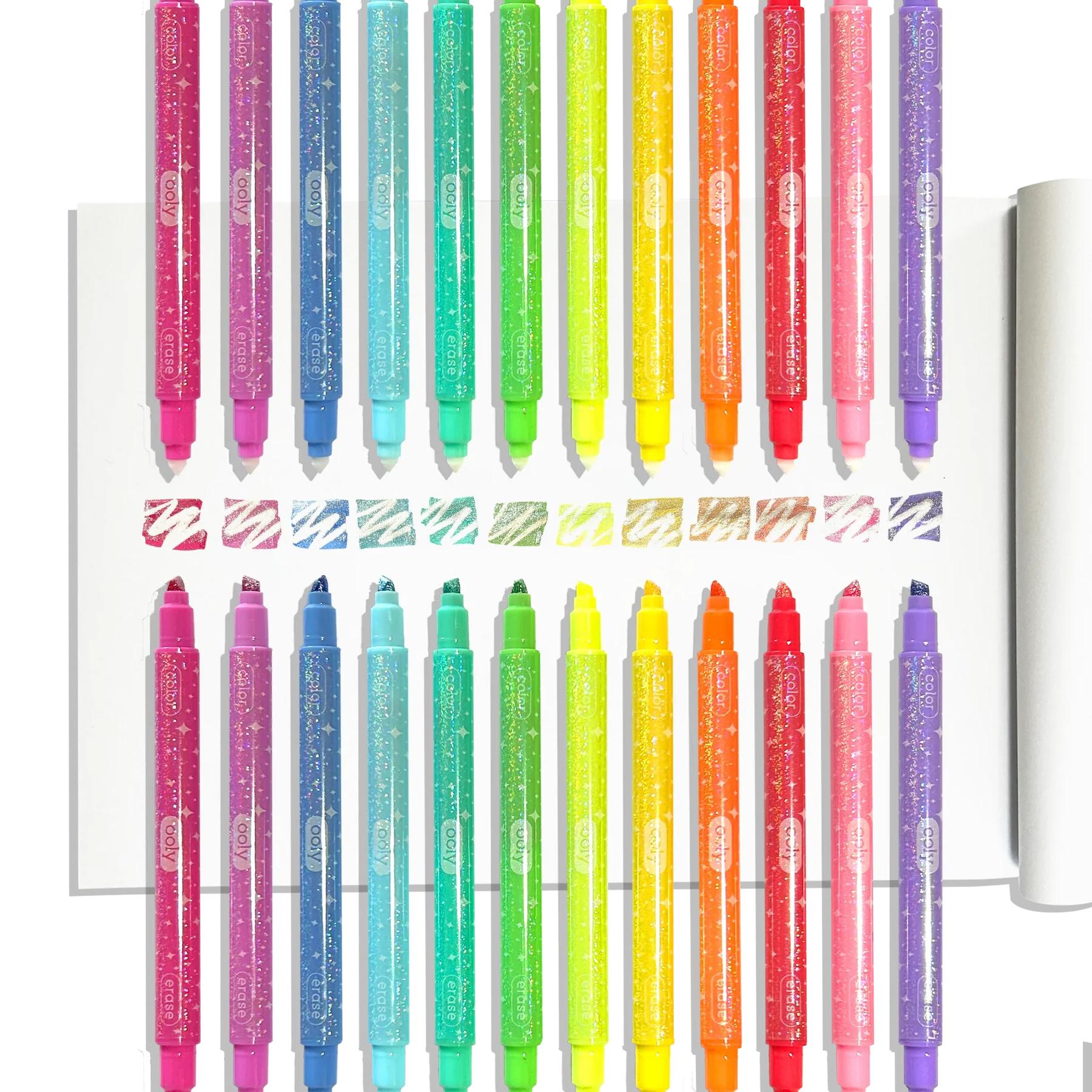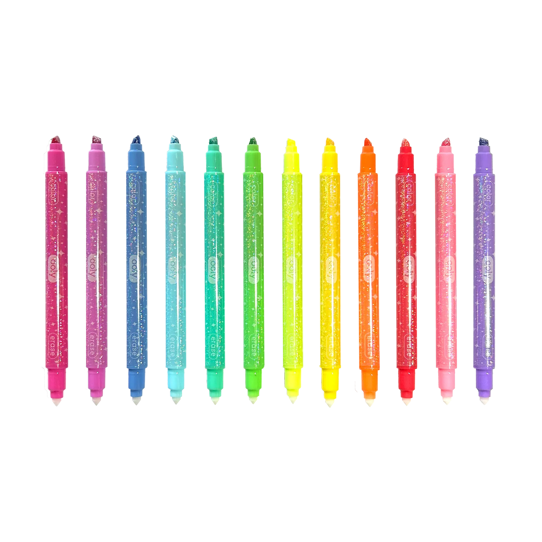 Sparkle, create, and erase with the Make No Mistake! Sparkle Glittery Erasable Markers! This set of 12 glitter markers lets you add dazzling color to your artwork, notes, and doodles—then fix any mistakes with ease. Each erasable marker features glittery ink on one end and a magic eraser tip on the other, so you can easily correct, refine your designs, and create negative space in your colorful creations.