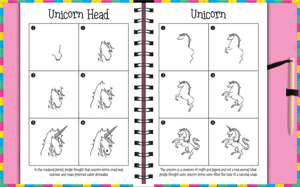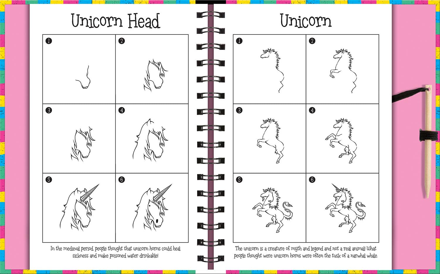 This art activity book includes 12 rainbow and foil scratch cards, 12 pictures to color, and 18 how to draw activities (from the number one bestselling How to Draw 101 step-by-step drawing technique on Amazon). A wooden drawing stylus and practice art paper are also included to unlock creativity with over 40 art activities.