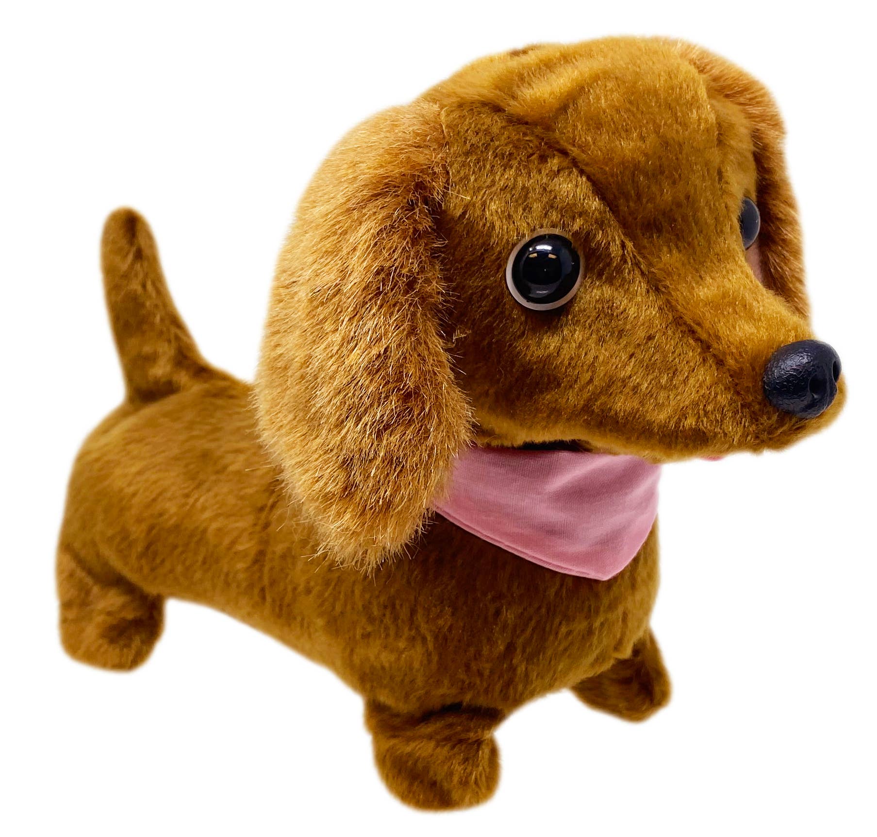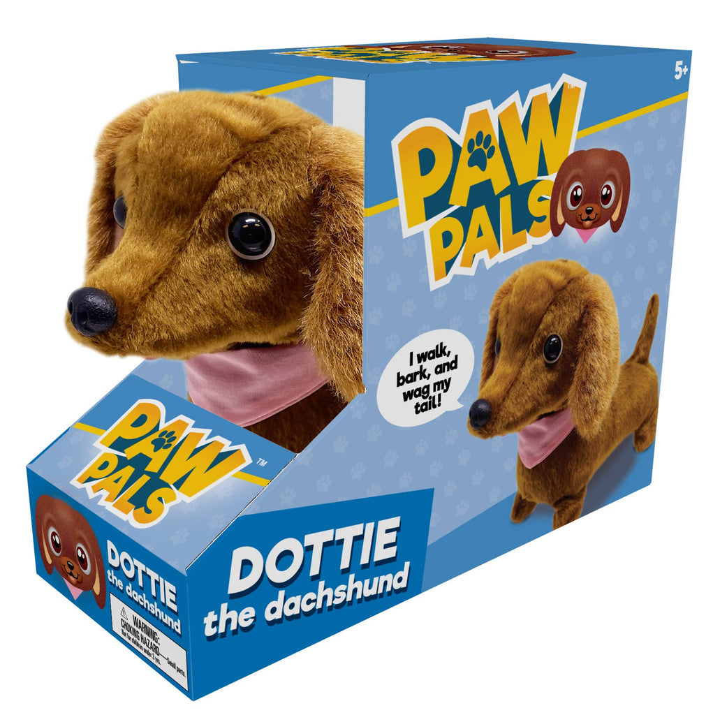 Nothing is cuter than Dottie! This robo puppy is the perfect first pet! Dottie is an adorable plush soft brown Dachshund with a little pink handkerchief who walks, barks and wags its tail. she comes in a perfect box for gifting. There is an off off switch to operate the 2 AA batteries required (not included). Ages 5+.