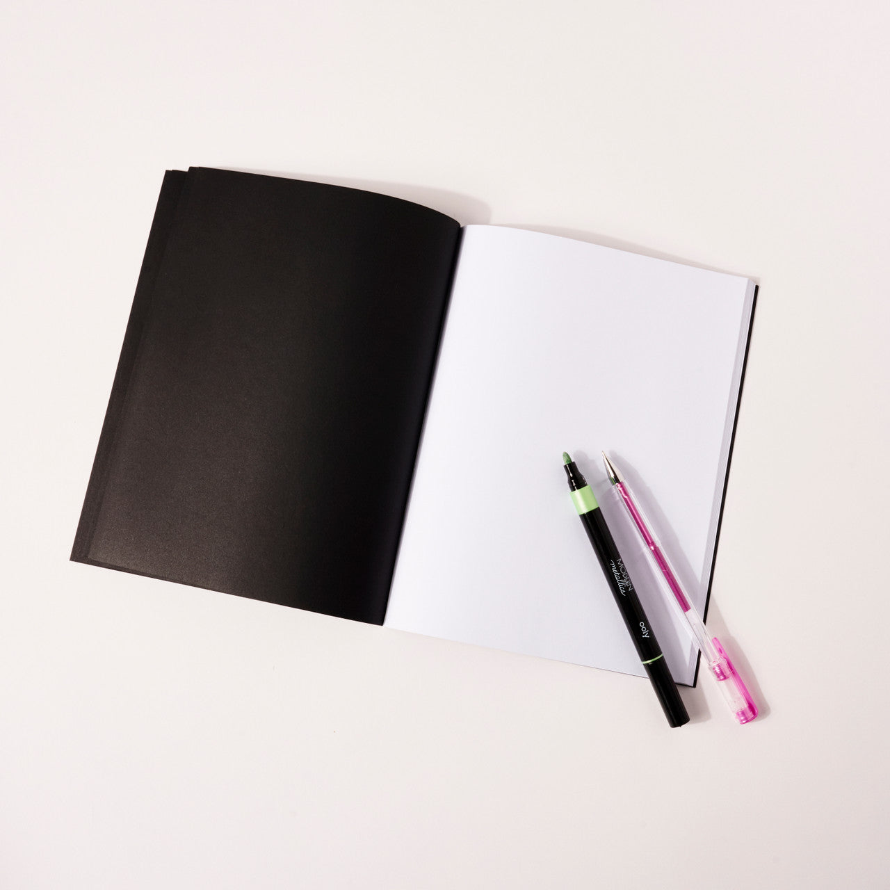• Includes: 40-page sketchbook (9” X 7") of 20 black paper pages & 20 white paper