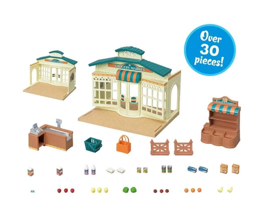Shop for fresh fruits, vegetables, drinks & more at the Grocery Market! This set includes over 3 pieces including food stand with milk, juice, eggs and produce, shopping basket and bag, cash register and checkout counter with a working conveyer belt! Connect to the Village Pizzeria to create Main Street in Calico Village, a place where families can gather to dine and shop! Box includes 1 Grocery Market.