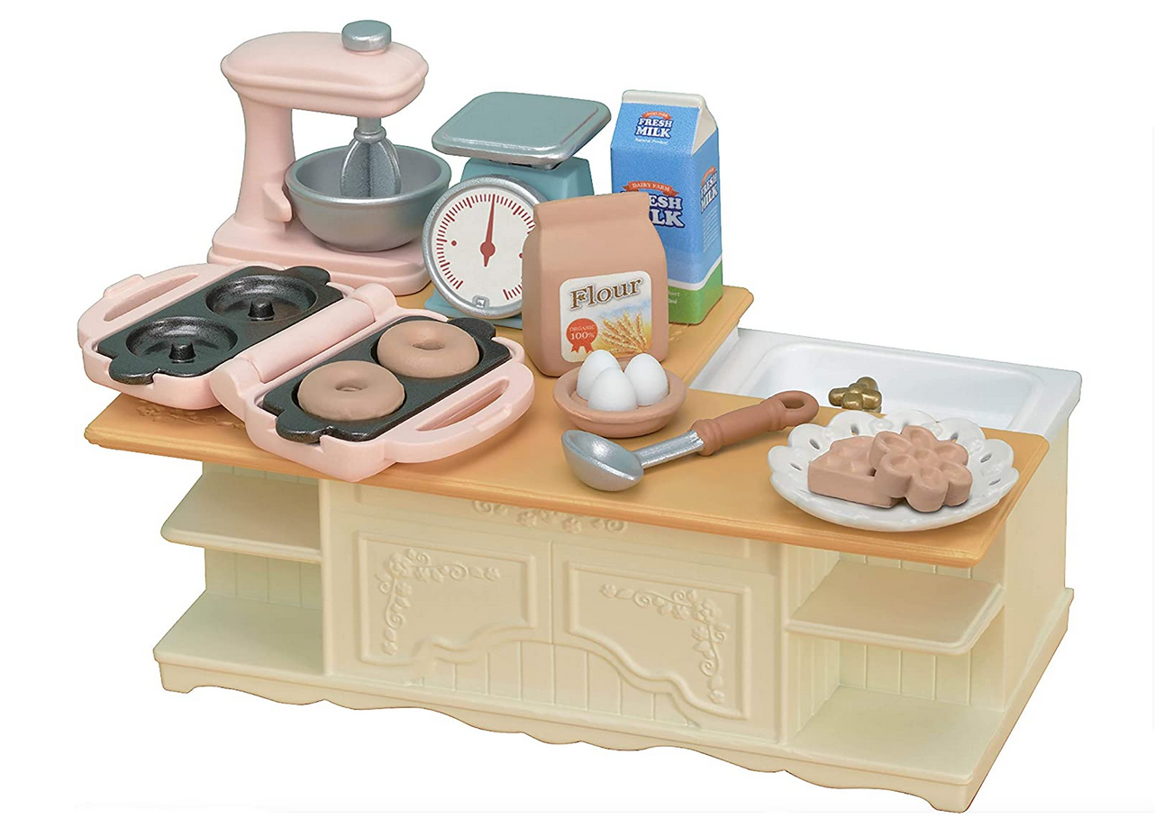 Calico Critters Kitchen Island is an essential furniture set for any Calico Critters dollhouse. This beautifully detailed and high quality set incorporates more than 18 pieces to create a larger kitchen! Furniture and accessories include the island, mixer, scale, doughnut and waffle maker, ladle, baking ingredients and more. Turn the knob on the mixer to spin the bowl, place food on the scale and watch it weigh, or interchange the plates on the waffle maker to make doughnuts! Box Includes Kitchen Island. Furniture is 1:24 scale.