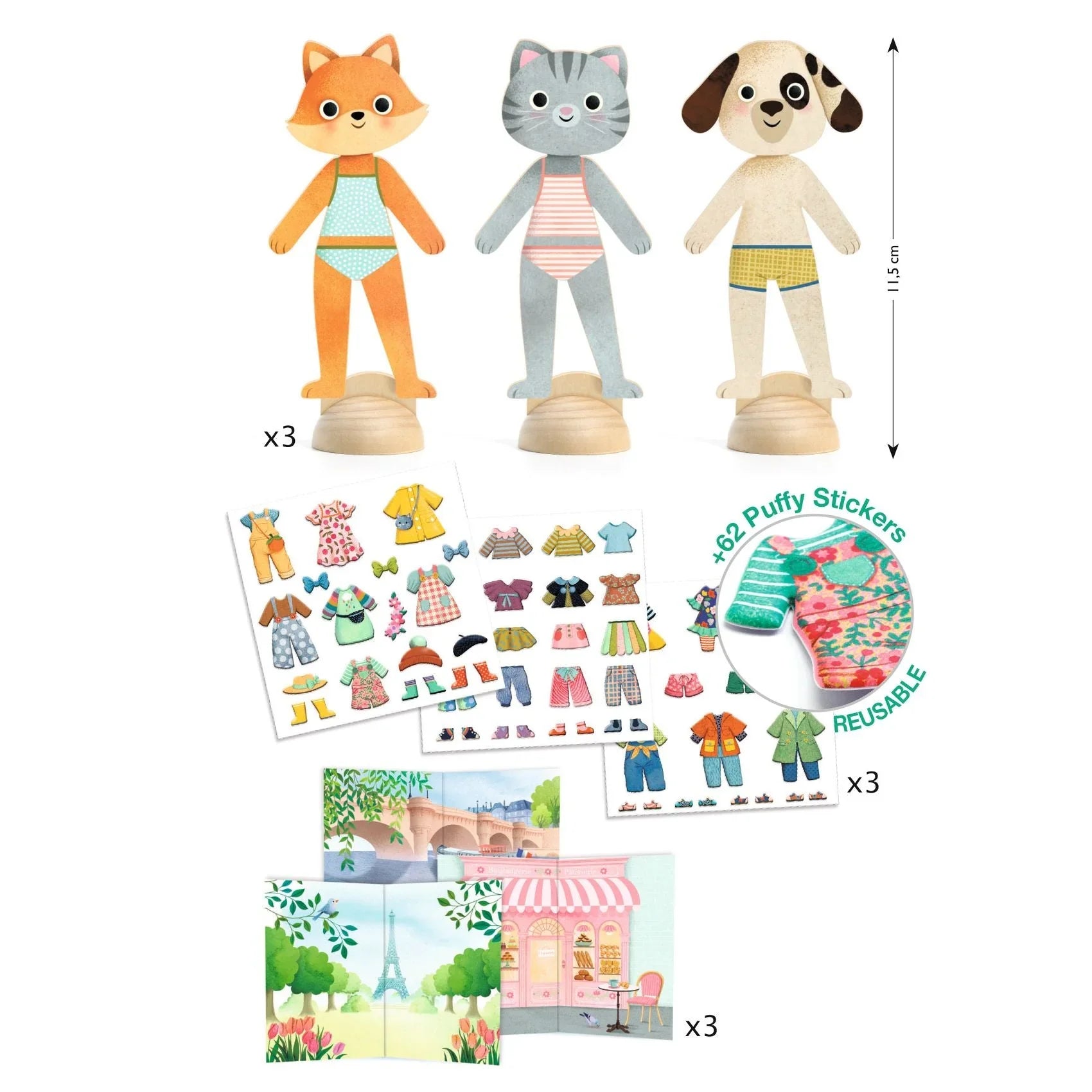 Contents: 3 wooden characters with stands, 45+ sturdy reusable items of clothing (3 sheets), 3 designs made of card and 1 step-by-step instruction booklet.