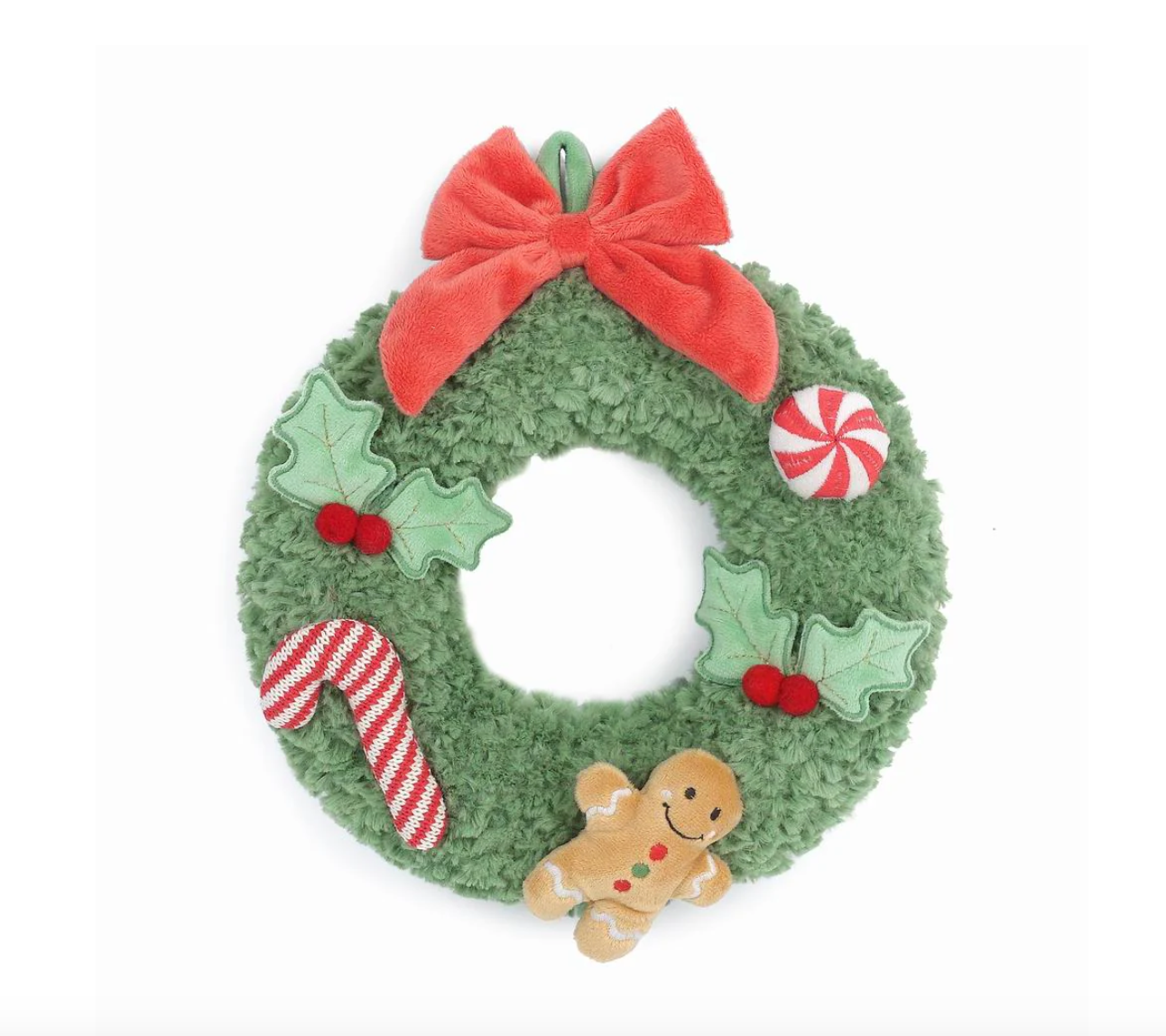 It's the most wonderful time of the year! Own it with our Festive Wreath Plush Toy. Festively festooned with a gingerbread man, peppermint candy, sprigs of holiday, and of course, a giant bow, Mon Ami's Christmas plush toy is an instant holiday favorite that will never wither. This evergreen wreath plush toy makes a fa-la-la-la-la-la-fabulous wall hanging or a pillow for a pint-sized head while watching holiday movies.